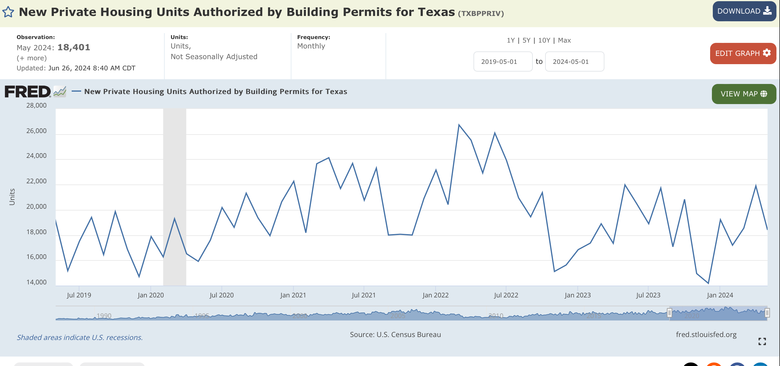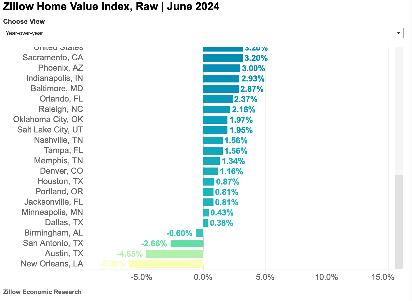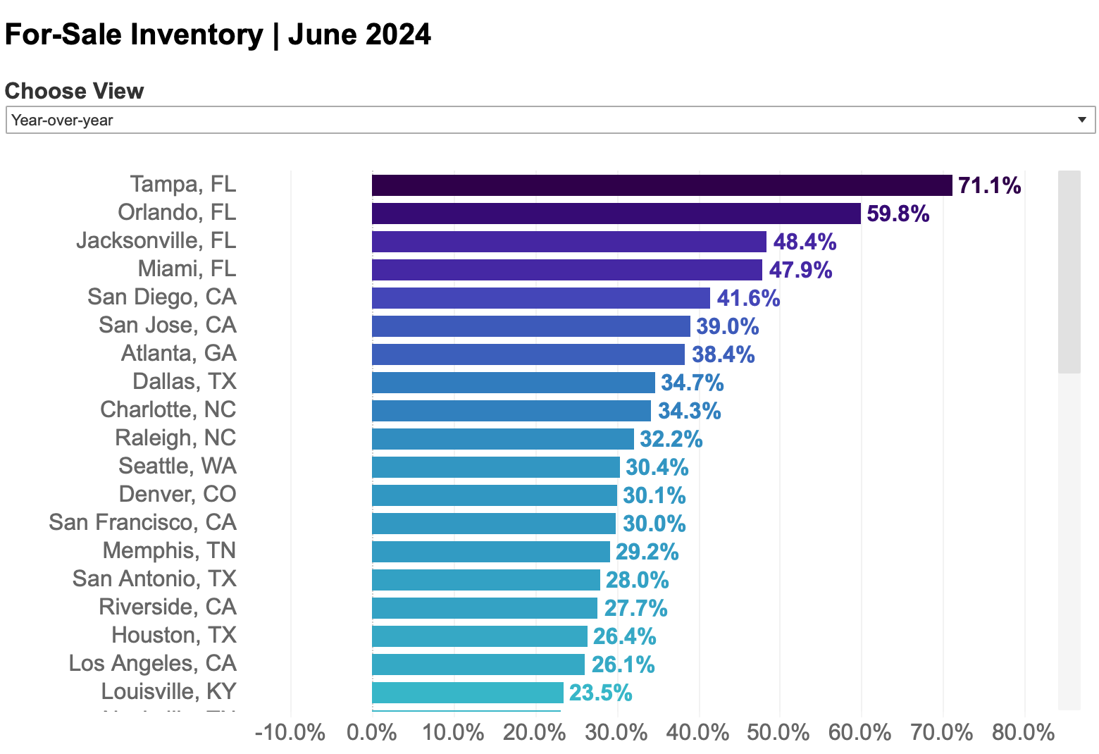 You can see that with the exception of some areas, such as the Bay Area which continue to grow strongly with rate of change as high as 10%, most urban areas see growth moderate quite a bit now. In Southern parts of the country, the rate of change is actually turning negative with the Austin area seeing tremendous drops year over year.