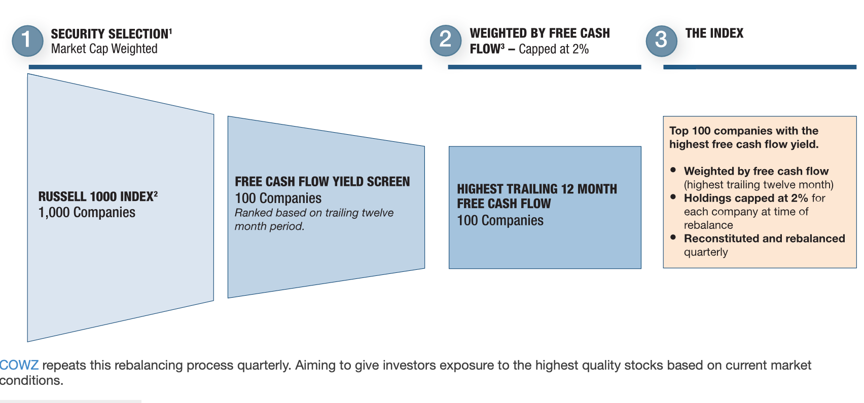 The COWZ fund managers screen Russell 1000 companies (smaller companies so more upside potentially) and find the highest Free Cash Flow (FCF) yielders out of that index. They keep the TOP 100 companies out of that list and they repeat this process every quarter. The max a company exposure can be is capped at 2%. This is really an excellent strategy in my view rather than having only the tech heavy, SOX stocks in my account.