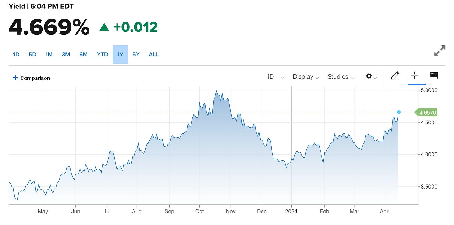Back in December, when it was trading sub 4%, and every one was calling for 6-7 rate cuts this year, I predicted we are probably going to end the year higher between 4.5% and 5% rather than closer to 2%.