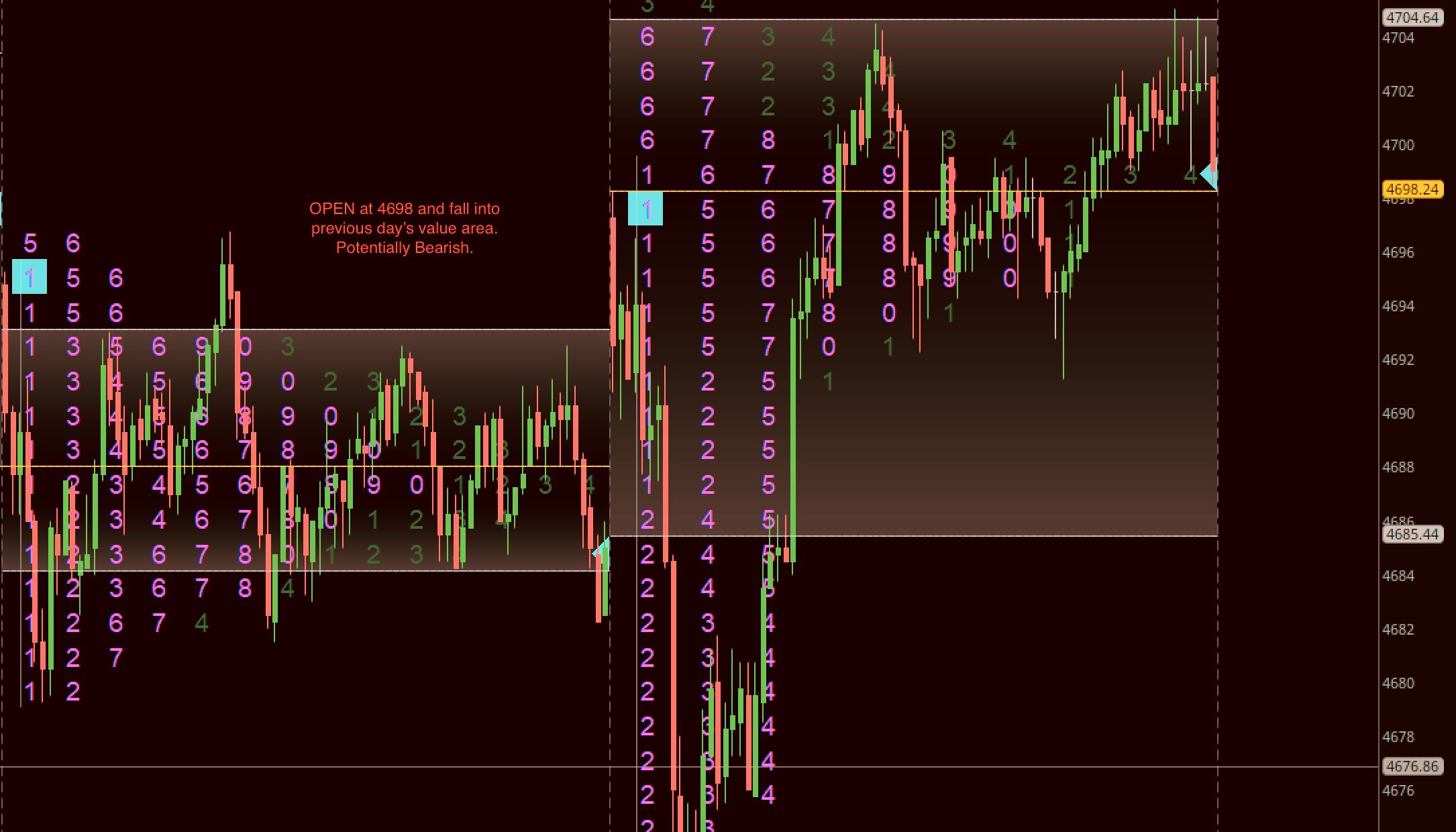 Having made that 20 point trip, we opened at 4698. Now while this was above 4684 and 4692, it was not far above enough to warrant a dip buying into the VAL. Was not worth it from a risk to reward perspective.