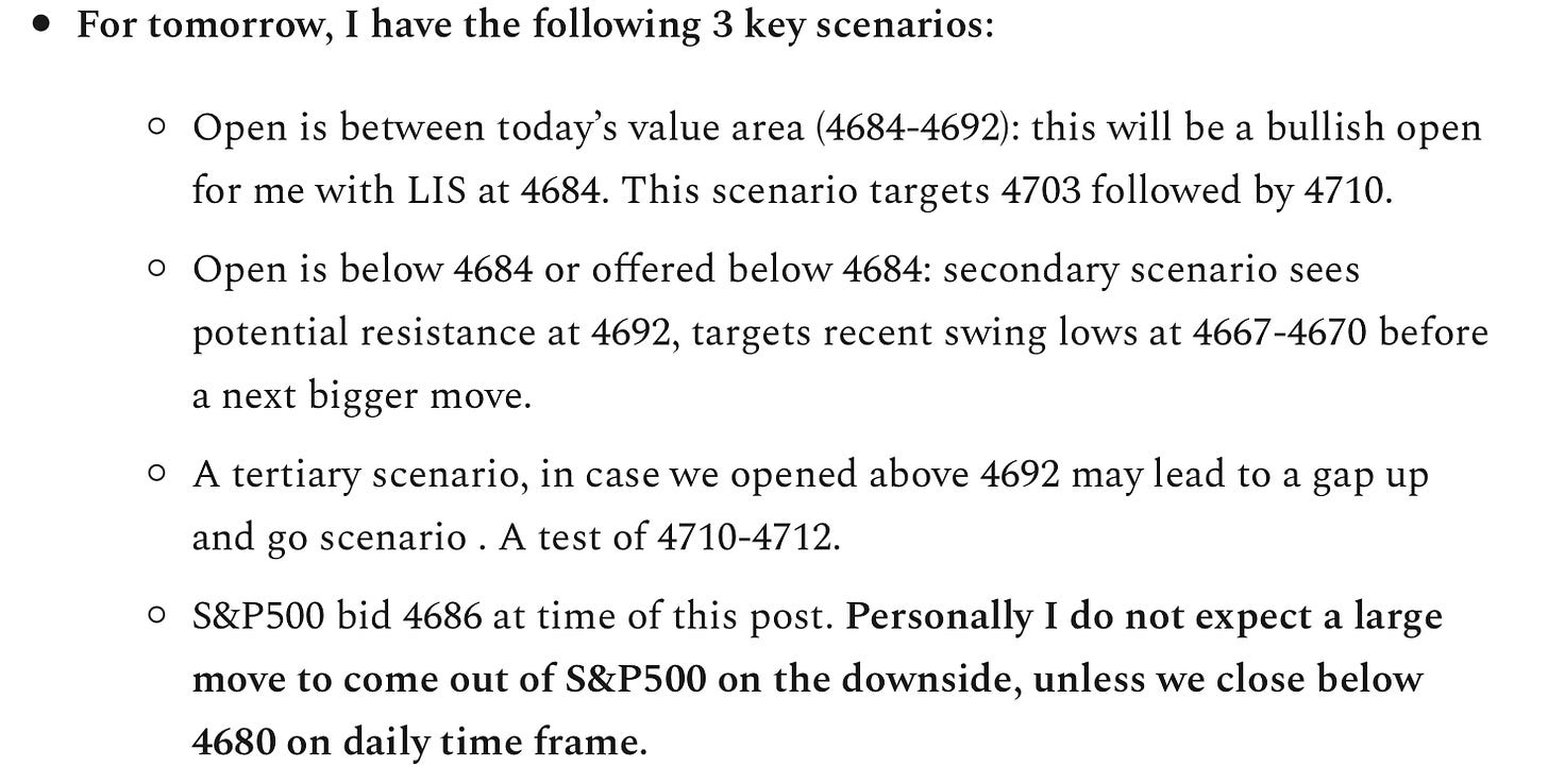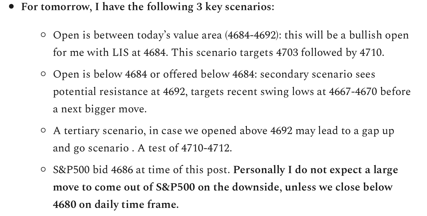 To summarize, a lot of opportunities for active traders. But if you had a directional bet , this was not your day. Unfortunately, this has been sort of the theme this whole week, and I do not expect a resolution as long as we balance here between 4670-4710.