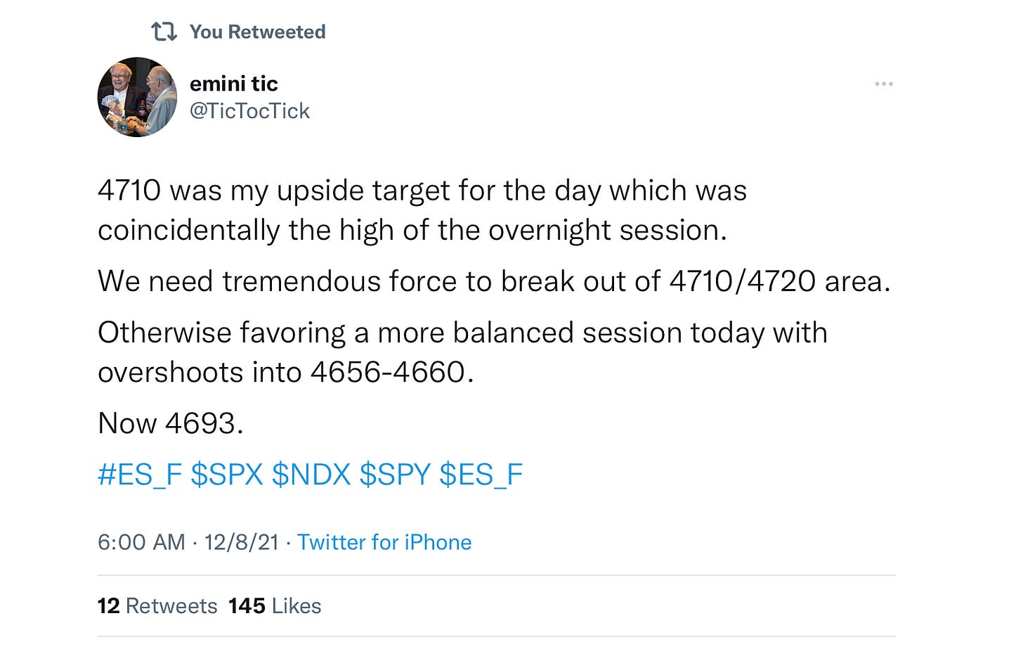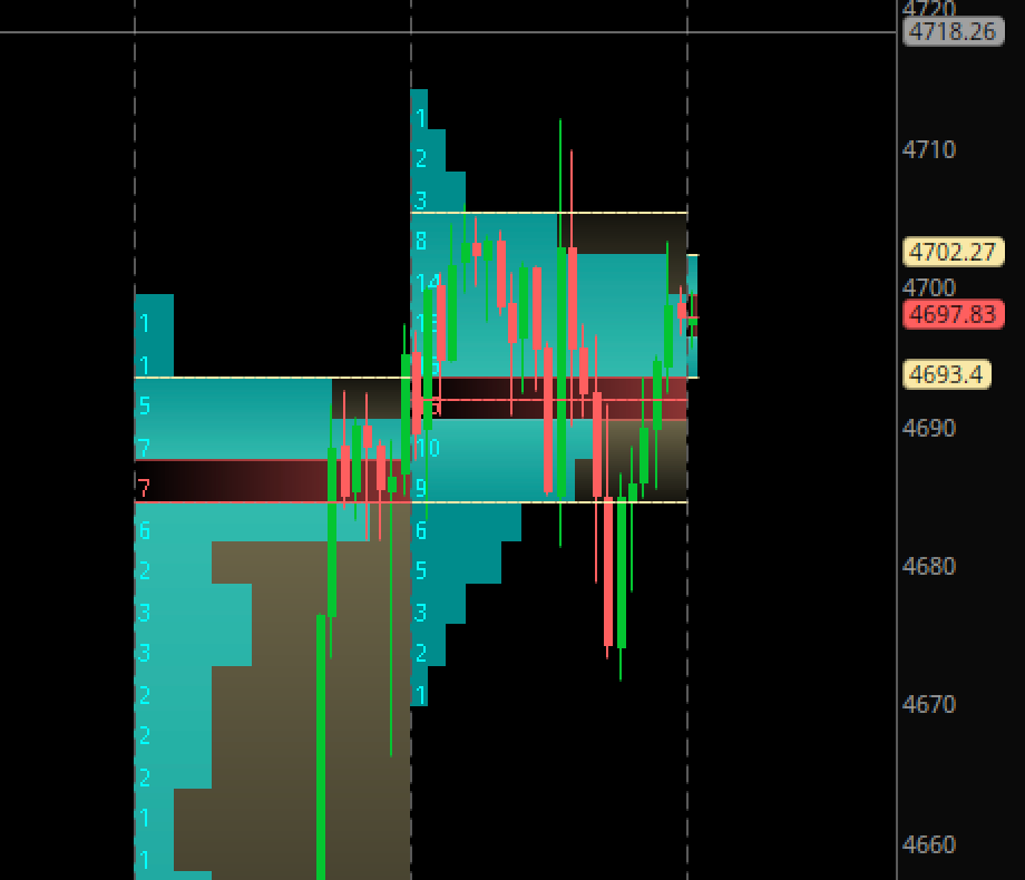 Very slow day today, coming on heels of such an active week and a half. About half an hour before the open today around 6 am, I called out this to be a balanced day at 4693. For most part we spent entire day below my 4693, with low of the day around 4670. 4693 broke in last half an hour of trading to bid as high as 4700. See below.