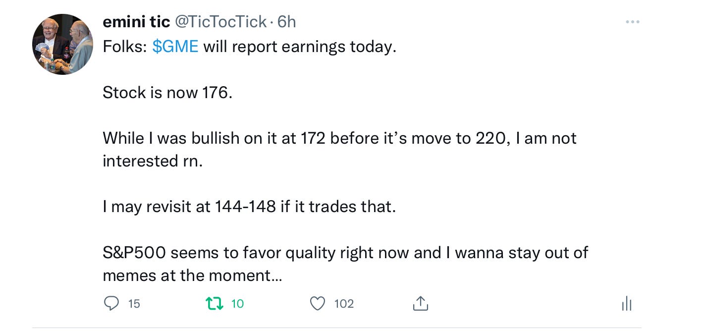 On the earnings side, I was lightly bearish on $GME at 176 today which fell to about 162 after hours but then got bid up again. I like 144-148 on this stock, that is if the dip buyers let it get there.