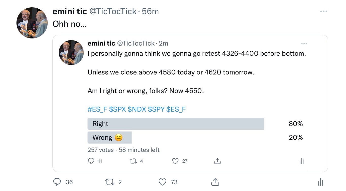 Then there is also the question of sentiment. I polled this an hour ago at 4560, and the response was overwhelmingly bullish. No wonder, we are now up about 30 handles from this poll!