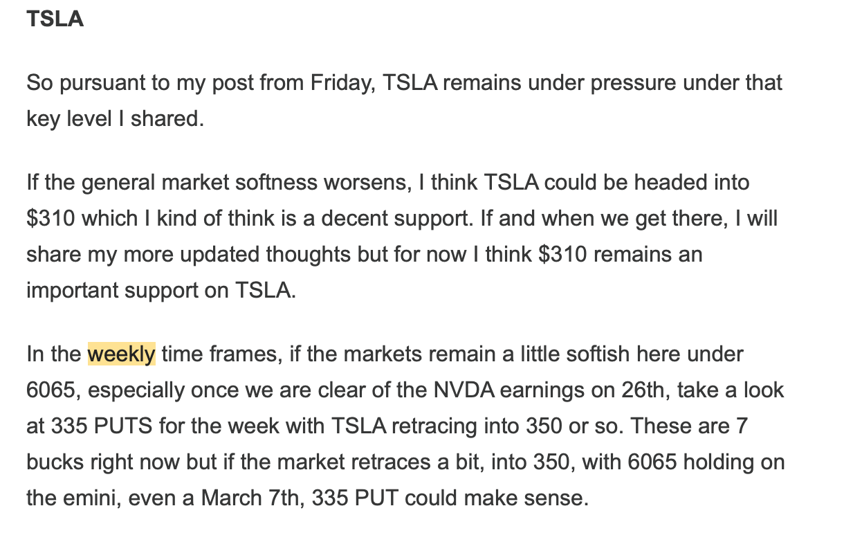 So once again we shared some good levels for folks which were almost the resistance and support on the day. Multiple times. See below for some PUTS from Sunday alone. As we said before, once we get into bear markets , the PUTs will be shared more and more frequently. These have 3x-5x in a couple days! You can see how our folks had advance intel on TSLA at 420! Before it shed 35% in a month!
