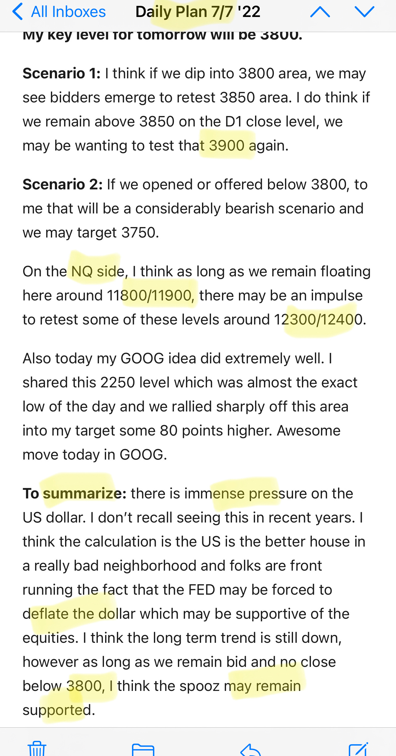 Then the Daily newsletter is tactical and the levels are geared for shorter term swing or intraday moves. As an active trader, I often have 2-3 scenarios. Pursuant to the letter last night, intraday, I do not predict. I react. And for me to be able to react, I need to do my preparation ahead of the day. I am not going to prepare my levels when the session in active. This is where the two scenarios come in. I want to know what will be my bias if we opened below 3800. I need to know what will be my primary bias if we opened above 3850.