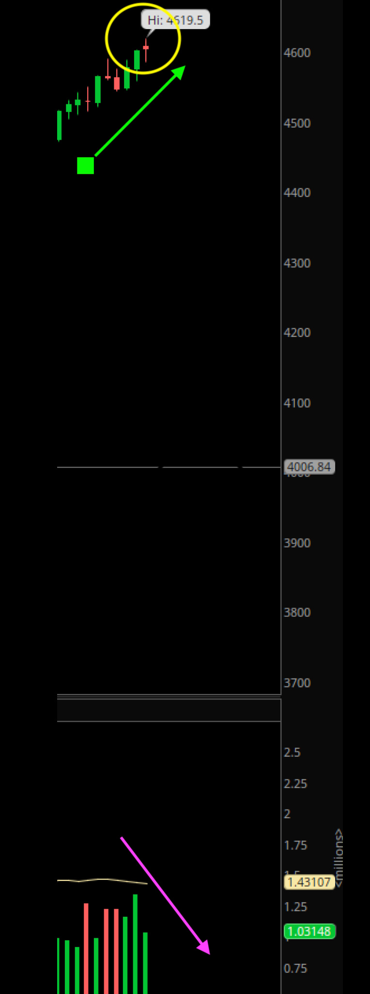 This is exactly how it went down. Shortly after the open today, we drifted down into this support area. This area provided not one but two bounces , each of about 15 handles.