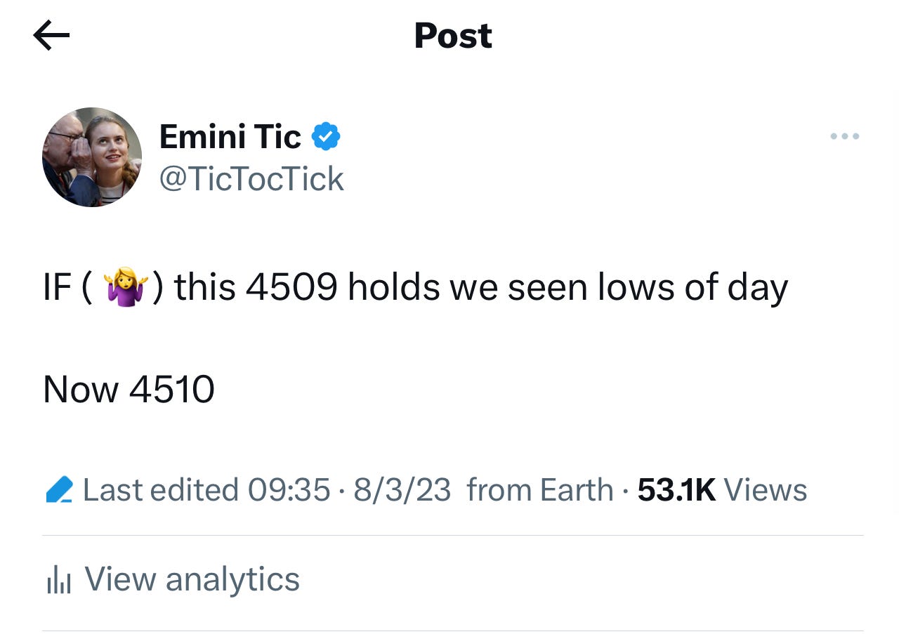 Happy weekend! Yet another day accentuated by my levels. I will not cover each one here but you can read last night’s plan if you want to. The market was encapsulated on both ends by my levels as well as this tweet below I sent which marked the low of the day before we rallied higher into 4540.