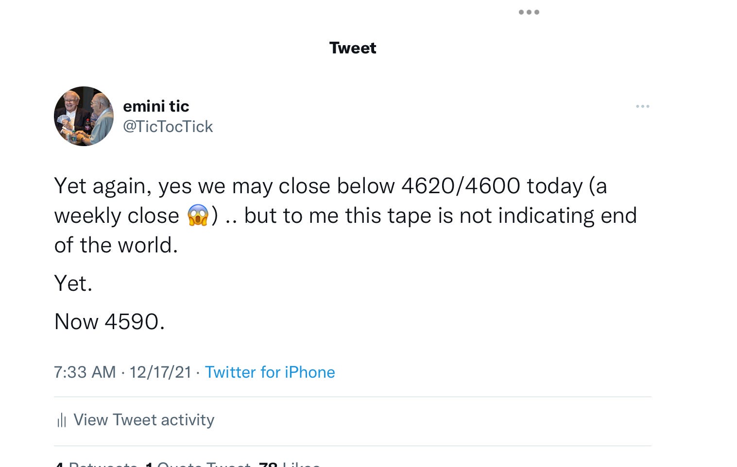 Ok, if I was feeling generous, I will say if the bears close below 4620 today, they may have a slight upper edge early next week, despite missing the marks on 4580. That should cheer up some folks.