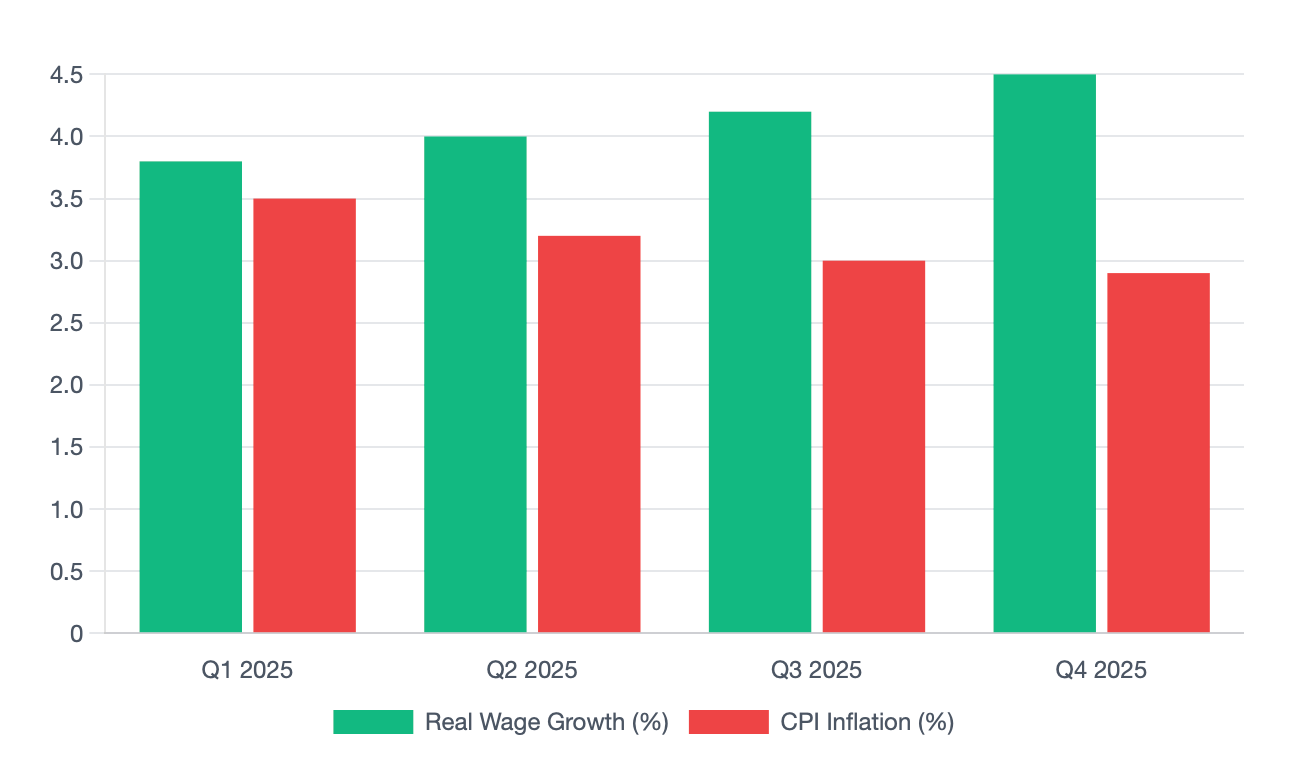 For the first time in several years, real wage growth consistently exceeded inflation in every single quarter, providing a buffer for household spending despite higher prices.