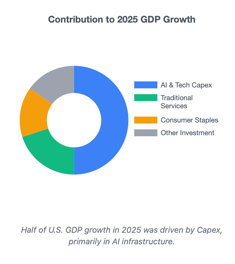Artificial Intelligence transitioned this year from a speculative trend to a fundamental economic driver for the US economy. Half of U.S. GDP growth in 2025 was driven by capital expenditure and investment, much of it concentrated in AI infrastructure.