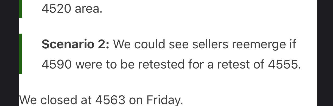 Scenario 2: We could see sellers reemerge if 4590 were to be retested for a retest of 4555.