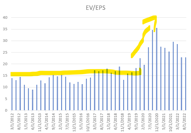 We see above that historically AAPL has been in a 10 to 15 range with the pandemic fueled spending making this surge to 35. It has since come down near 20-25 but I do not think it will stay here. I do think these will deflate further and will settle near 15.