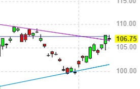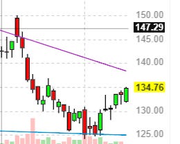 We have now seen about a 20% rally off the lows and the market seems to stall every time it touches 123-126 area. Tesla management also caused another flutter in the automotive industry by suddenly lowering the prices on all of it’s products by as much as 15%. This brings most of their vehicles within a range to allow some to claim the Federal EV tax credit to the tune of 7500 dollars - this puts the total discounts in the vicinity of 20% plus.