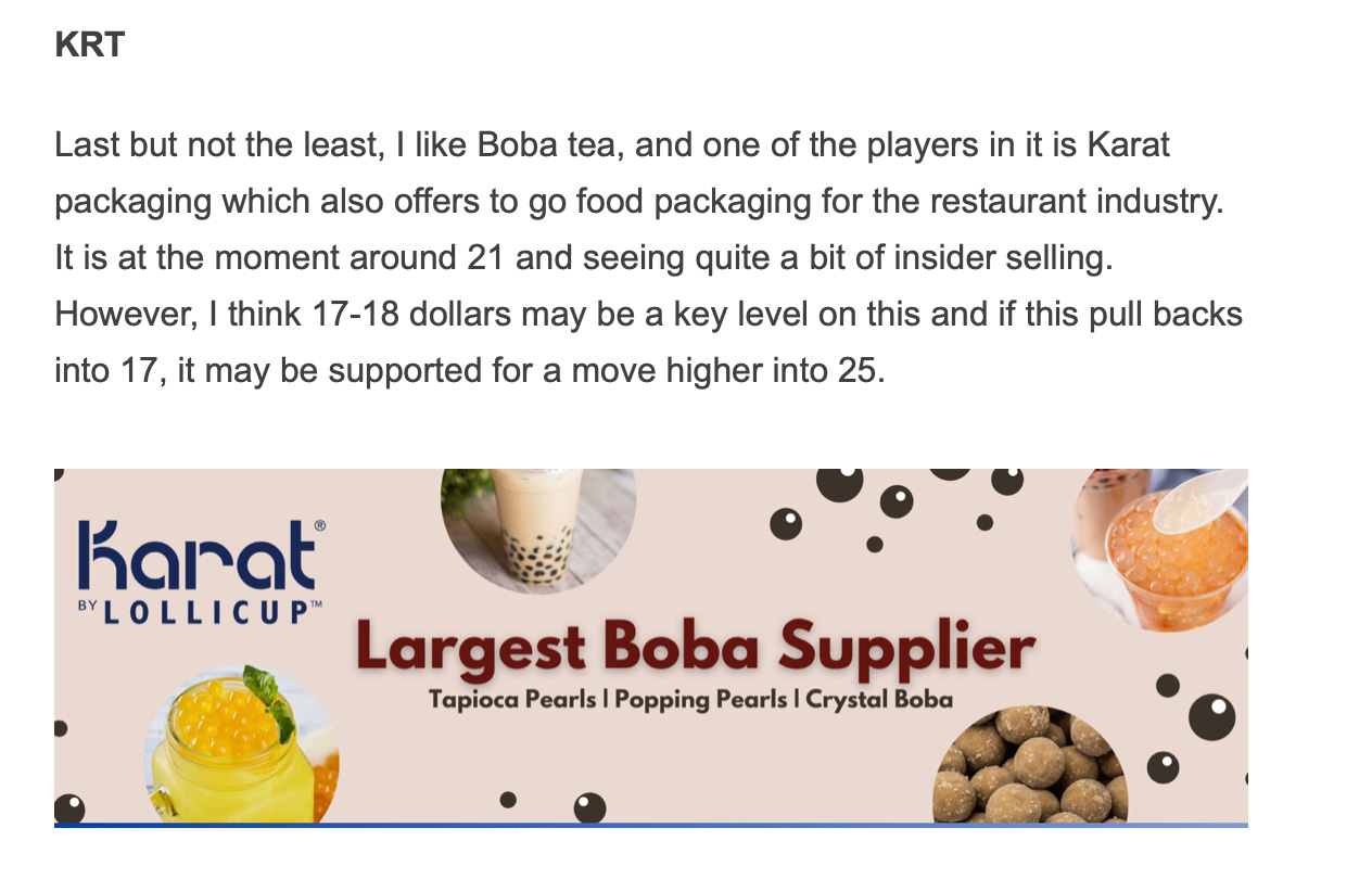 I shared the Boba tea stock KRT near 17 bucks. The stock pulled back into this 17 handle and as if magically found support to now trade slightly above $23 area.