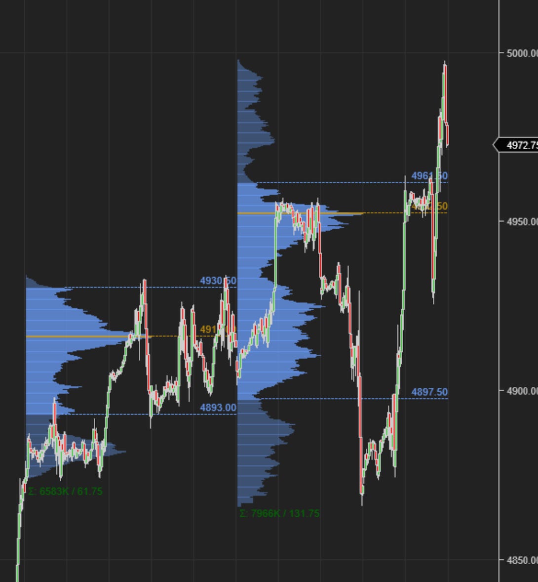 On Friday, the market top ticked at 4980 and closed a few handles below it. The most important auction past week was that of the Wednesday with the FOMC. As is with the key levels, they have a tendency of revisiting and this week may be no different.
