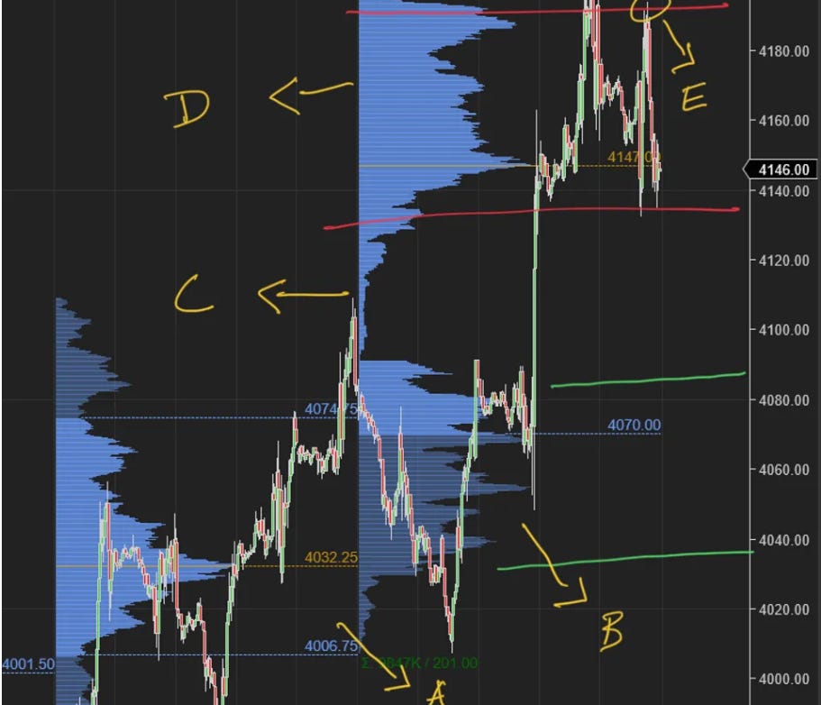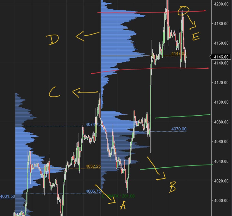 Scenario 2: if we continue to close back in D and E area, this is potentially favoring bulls and we could want to retest the 4200 area again. At time of this blog, we last traded around 4150.