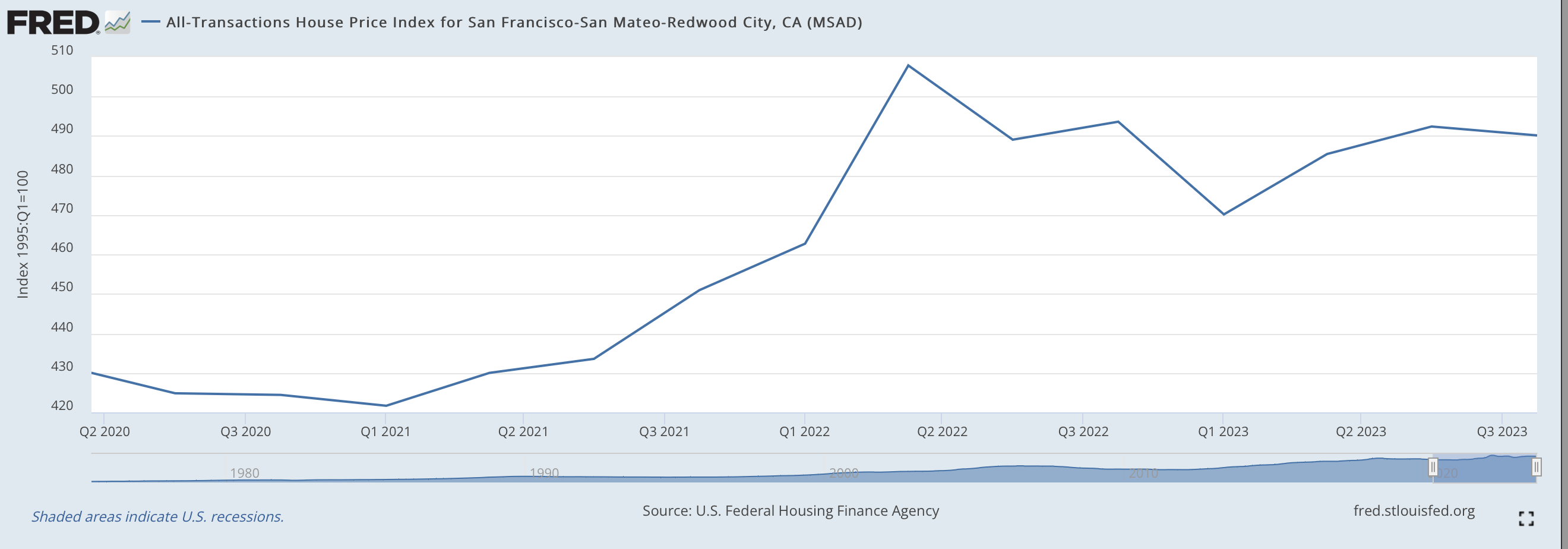 In recent months, there have been closer to 200,000 layoffs in tech sector, and despite impressive gains in the tech sector stocks, the home prices in last couple of years have stalled in tech industry heavy Bay Area. Below chart shows this sampling using the San Mateo SFO sector.