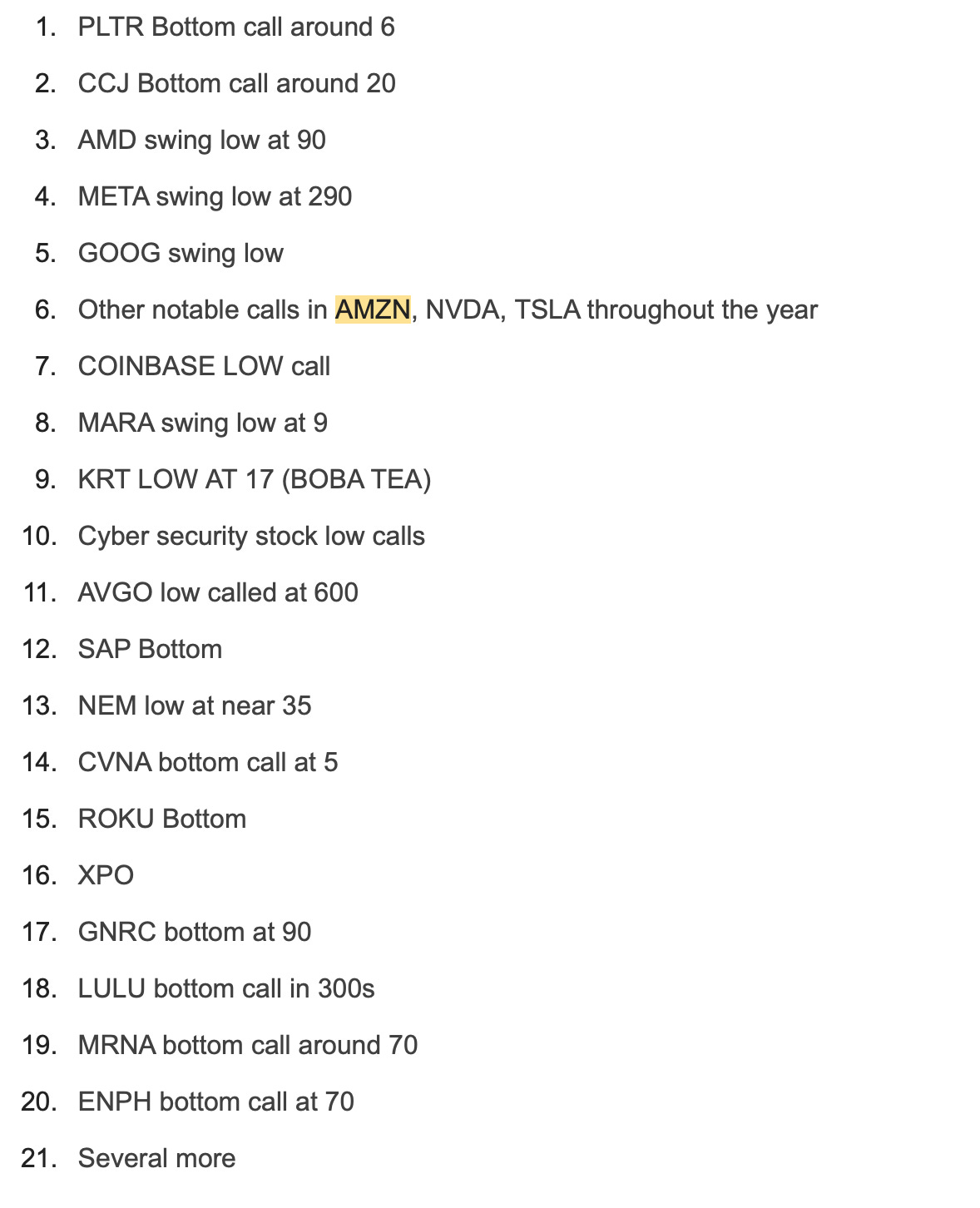 Below is a sample list of stocks I was bullish on about 3 months ago. You can compare where they are now compared to these levels shared about 12-16 weeks ago.