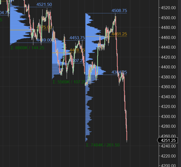 Look at all these LVN and single prints here while S&P500 shed 250 points in last 2 days. I expect at some point these will be filled and an HVN will form here that may decide if we get to test 4466 from here at the lows or make a dash for 4000. More on this later.