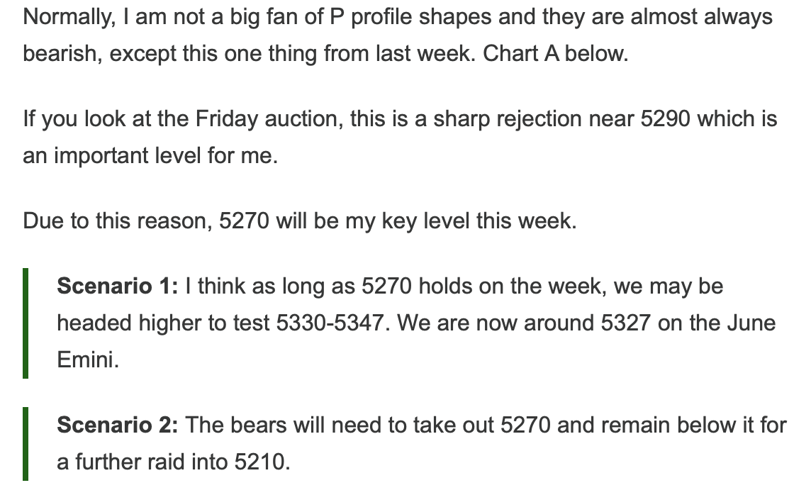 In terms of continuous auction, which is a propriety auction framework developed by me, the primary expectation last week was to dips being bought into 5270. What was the low of this week?
