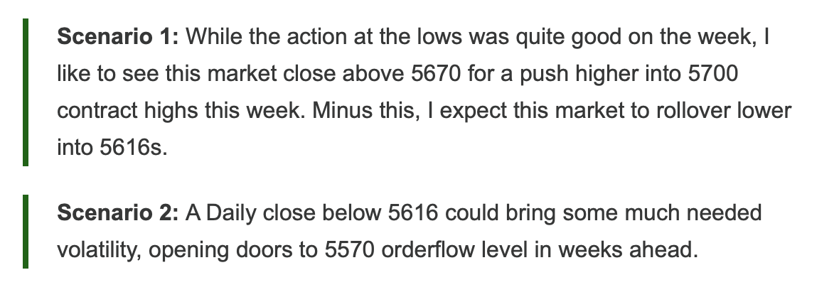 Scenario 1: I think this is a technical breakout as long as 5630 holds, and I do not want to be bearish, unless we see a close below 5630. This could target recent highs at 5703. We last traded 5650 at Friday close.